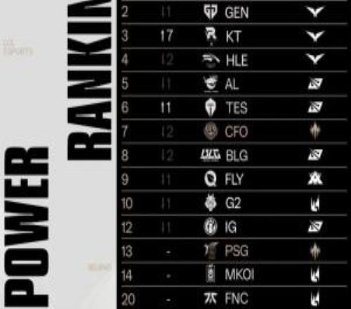 体育资讯11月9日称 近日拳头发布最新LOL战队全球实力榜,前四皆被LCK赛区队伍占据,目前T1超越Gen.G位列头名,KT上升7名排在第三,AL位列第五,TES位列第六,BLG位列第八!