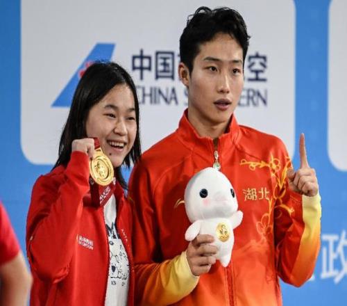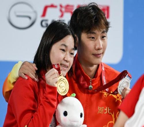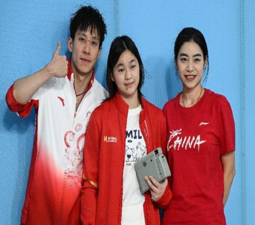 全红婵与王宗源(右)合影。新华社发