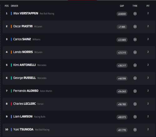第五至第十名分别是:安东内利、拉塞尔、阿隆索、勒克莱尔、劳森和角田。
